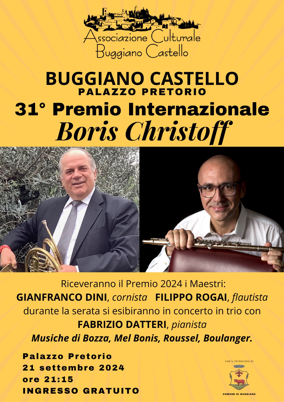 Sabato 21 settembre 2024, alle ore 21.15, presso il Palazzo Pretorio di Buggiano Castello, 31° premio internazionale Boris Christoff.