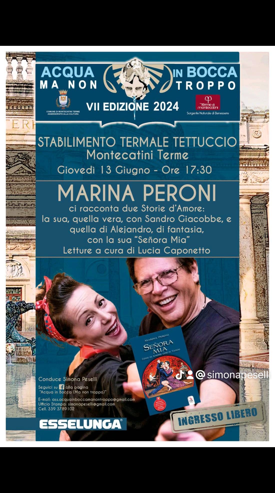 Giovedì 13 giugno alle 17, Marina Peroni racconta due storie d’amore: la sua, quella vera, con Sandro Giacobbe, e quella di Alejandra, di fantasia, con la sua Señora mia. Come in amore, così in tango. Con contenuti multimediali (ERGA).