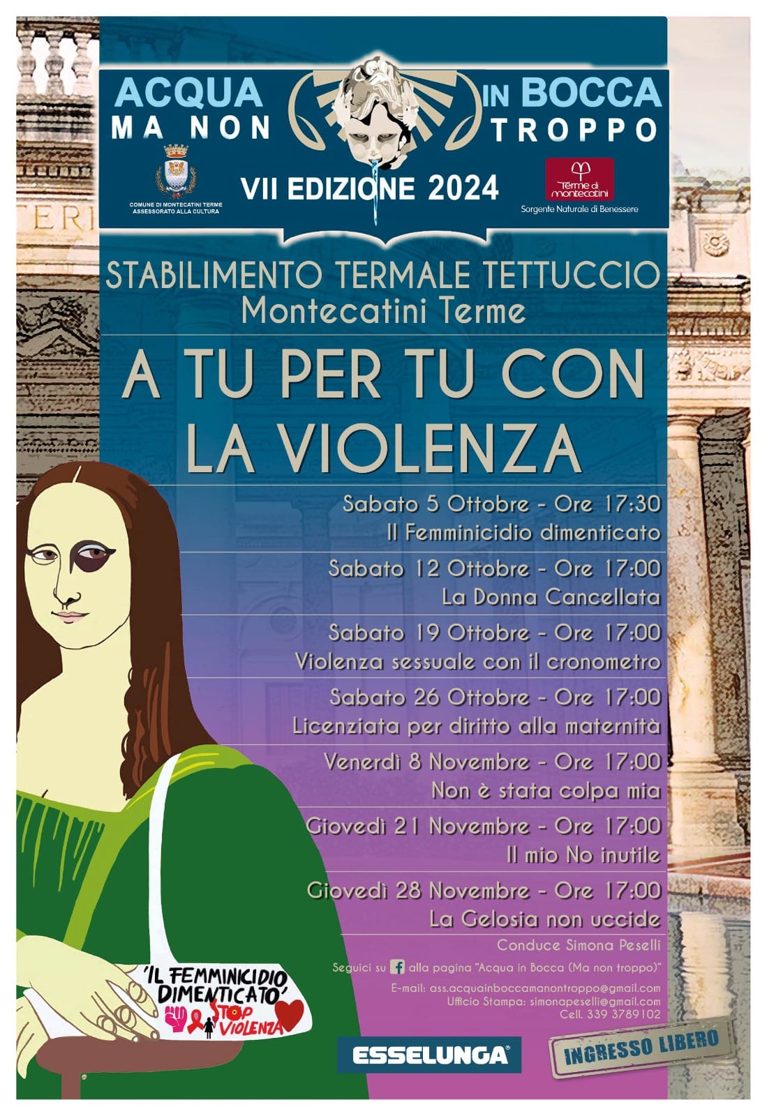 All’interno del suggestivo complesso delle Terme Tettuccio, continuano gli appuntamenti della rassegna Acqua in bocca, ma non troppo con 7 incontri del ciclo A tu per tu con la violenza, che si terrà dal 5 ottobre al 30 novembre 2024.