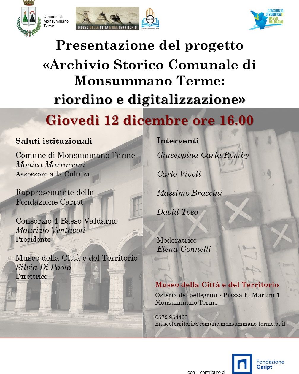 Giovedì 12 dicembre 2024, alle ore 16, presso la saletta del Museo della Città e del Territorio di Monsummano Terme, verrà presentato il progetto Archivio Storico Comunale di Monsummano Terme: riordino e digitalizzazione.