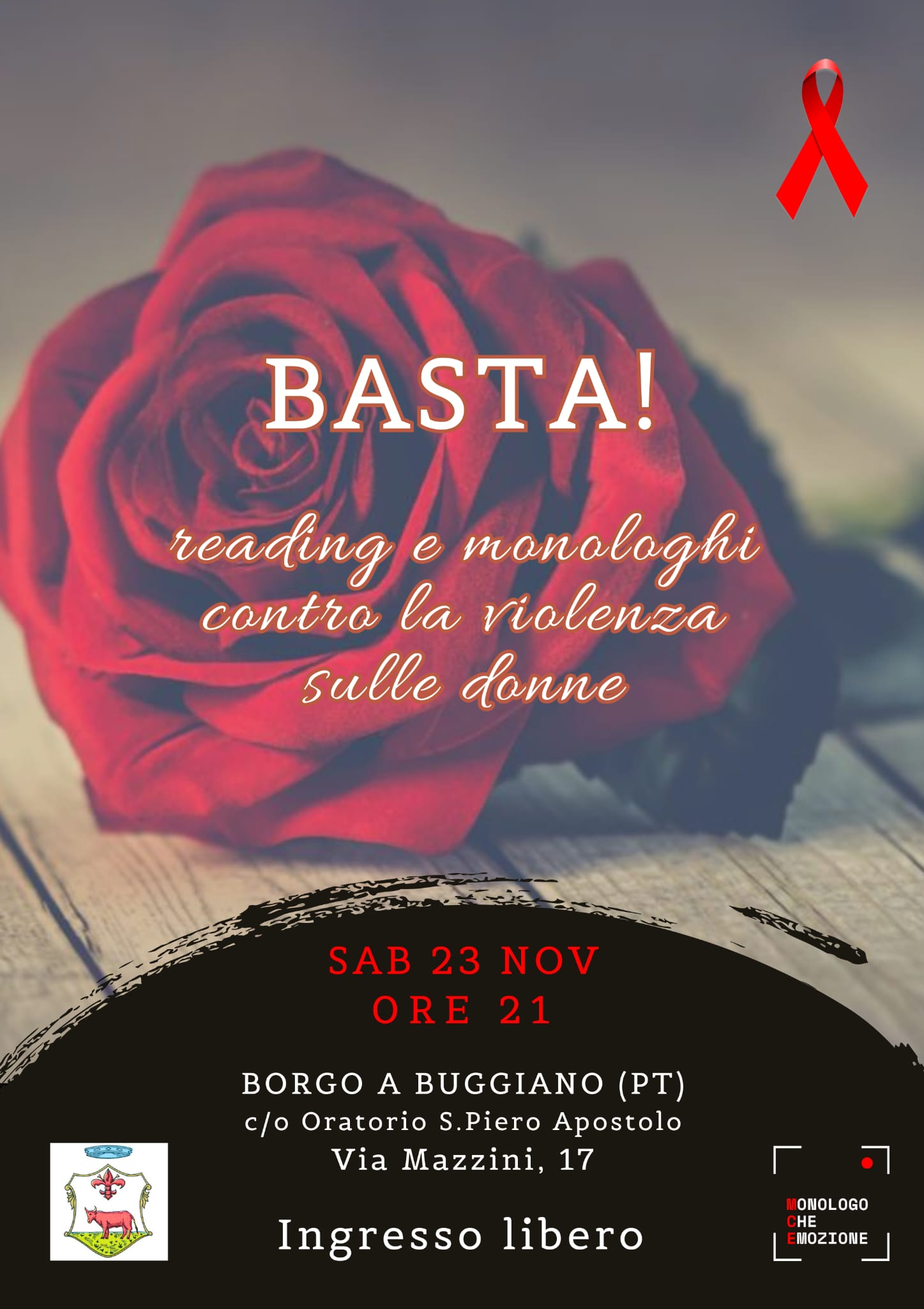 In occasione della Giornata internazionale per l’eliminazione della violenza contro le donne, sabato 23 novembre 2024, alle ore 21, presso l’oratorio della parrocchia San Pietro Apostolo di Borgo a Buggiano, va in scena Basta! Reading e monologhi contro la violenza sulle donne.