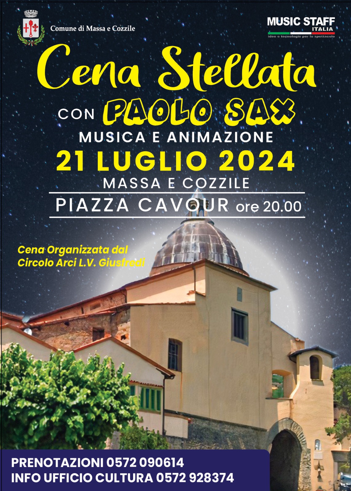 In piazza Cavour, nella suggestiva cornice dello storico borgo di Massa, a Massa e Cozzile, domenica 21 luglio 2024, alle ore 20, Cena Stellata organizzata dal Circolo Arci L.V. Giusfredi.