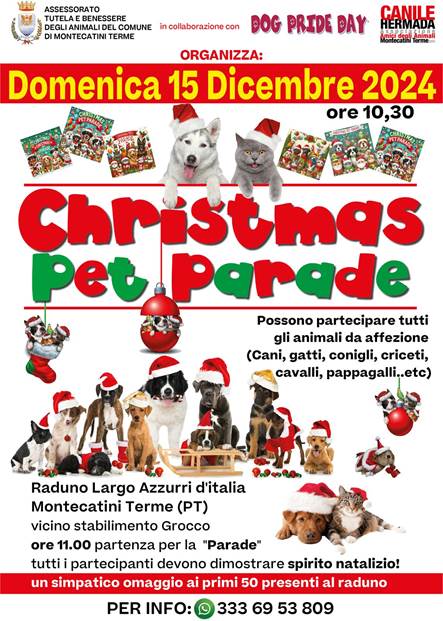 Domenica 15 dicembre 2024, a Montecatini Terme, non perdetevi la Christmas Pet Parade, un evento aperto a tutti gli animali da compagnia: cani, gatti, conigli, criceti, cavalli, pappagalli e molti altri potranno sfilare insieme ai loro proprietari per le vie del centro. L’unico requisito? Mostrare un autentico spirito natalizio!