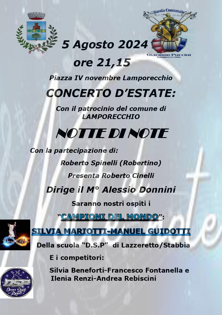 Lunedì 5 agosto 2024, alle ore 21.15, in piazza IV novembre, torna a Lamporecchio l’appuntamento con il concerto d’estate della Banda Comunale Giacomo Puccini Notte di note, con la partecipazione di Roberto Spinelli.