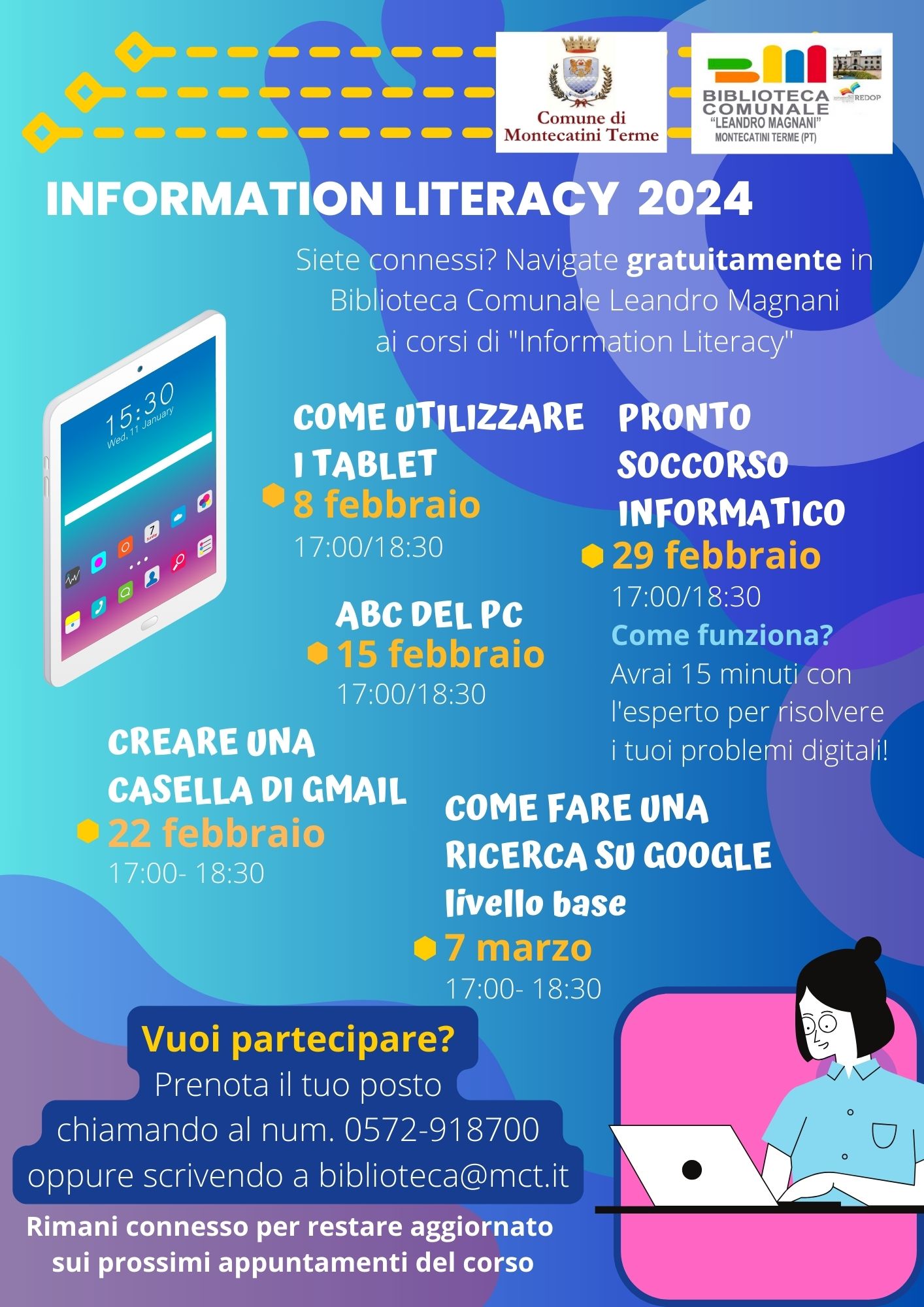 Scoprite i segreti di internet e della navigazione on line con i corsi di Information LiteracyPresso la Biblioteca Comunale Leandro Magni di Montecatini Terme potrete muovere i primi passi nel mondo dell’informatica in piena sicurezza.