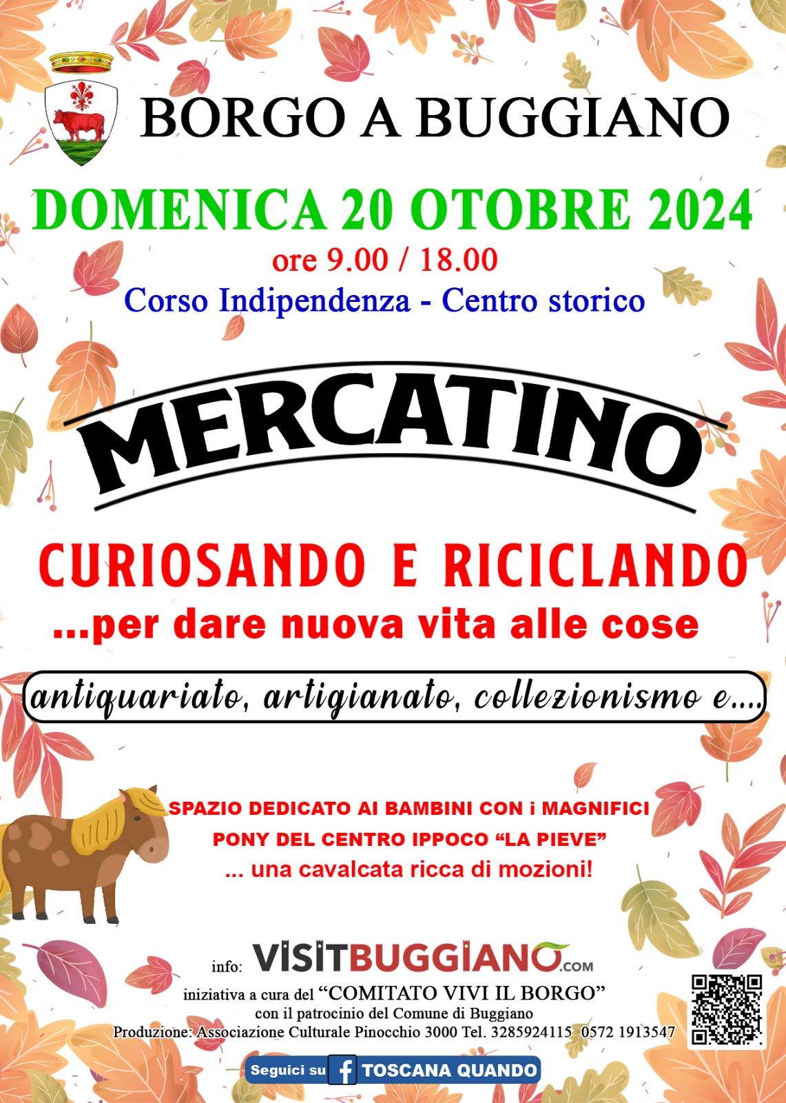 Domenica 20 ottobre 2024, dalle ore 9 alle 18, lungo Corso Indipendenza e il centro storico di Borgo a Buggiano, mercatino Curiosando e riciclando.