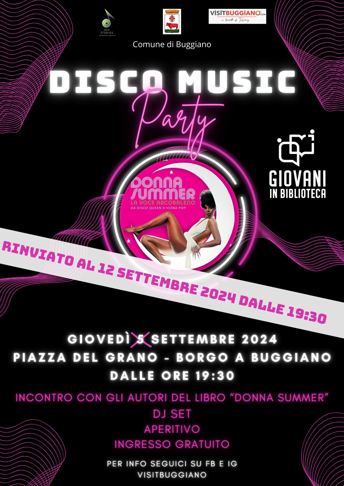 Giovedì 12 settembre 2024, dalle ore 19.30, Disco Music Party in piazza del Grano a Borgo a Buggiano.
