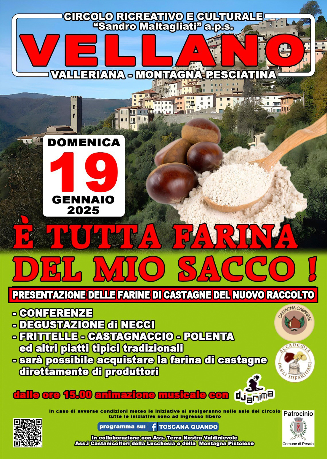 Domenica 19 gennaio 2025, per iniziativa del Circolo Sandro Maltagliati aps, torna a Vellano la festa della farina di castagne É tutta farina del mio sacco.