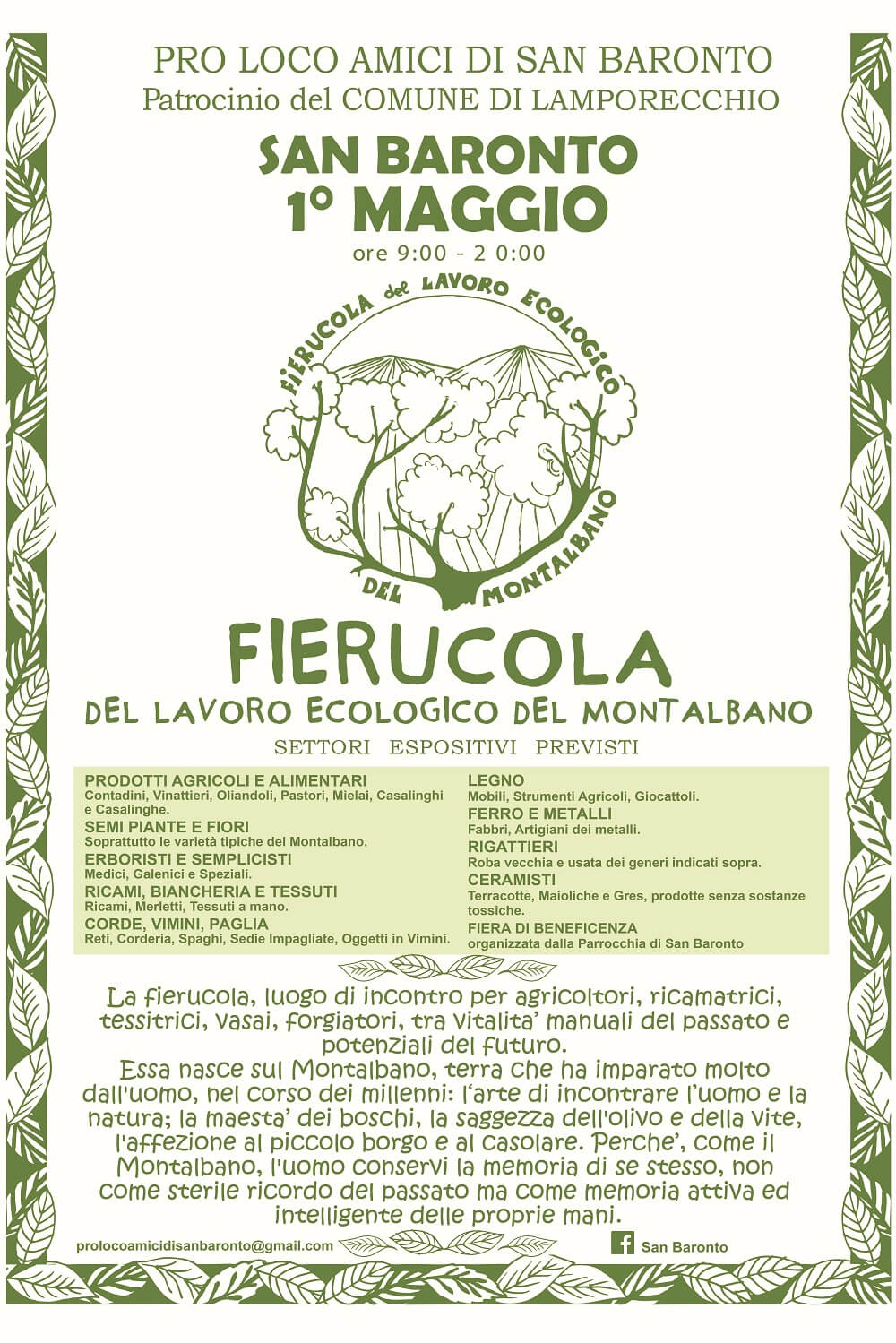 Mercoledì 1 maggio 2024, torna il tradizionale appuntamento con la Fierucola del lavoro ecologico del Montalbano organizzata dalla Pro Loco Amici di San Baronto Aps con il patrocinio del comune di Lamporecchio. L’iniziativa festeggia la sua 35° edizione.