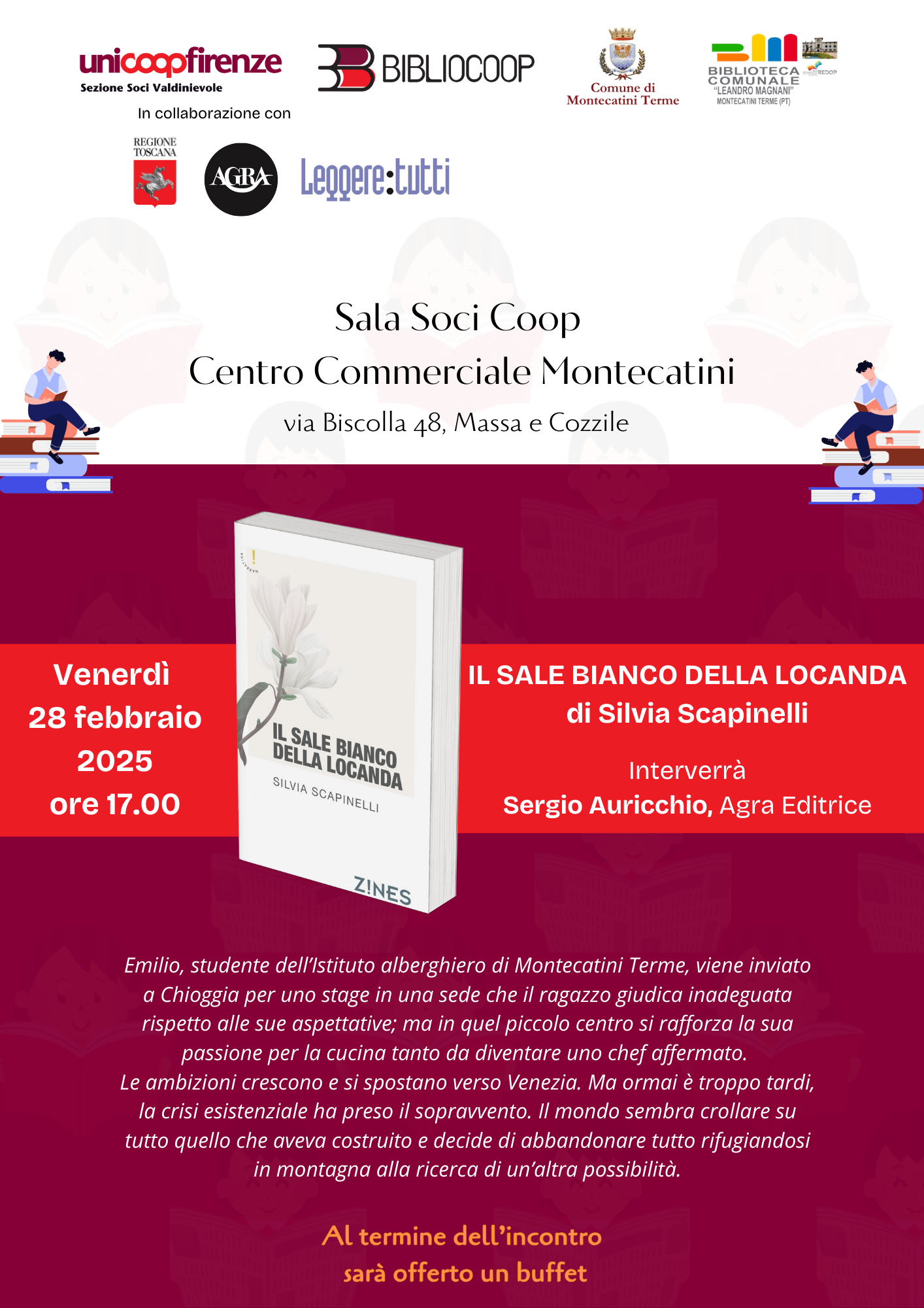 Presso la sala soci Coop del Centro Commerciale Montecatini Terme, a Massa e Cozzile, venerdì 28 febbraio 2025, alle ore 17, l’autrice Silvia Scapinelli presenterà il suo libro Il sale bianco della locanda. Interverrà Sergio Auricchio di Agra Editrice.