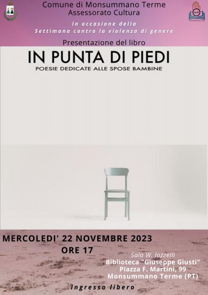 In occasione della Settimana contro la violenza di genere, mercoledì 22 novembre alle ore 17, nella Sala Walter Iozzelli della Biblioteca comunale Giuseppe Giusti di Monsummano Terme, presentazione del libro In punta di piedi. Poesie dedicate alle spose bambine di Susy Gillo.