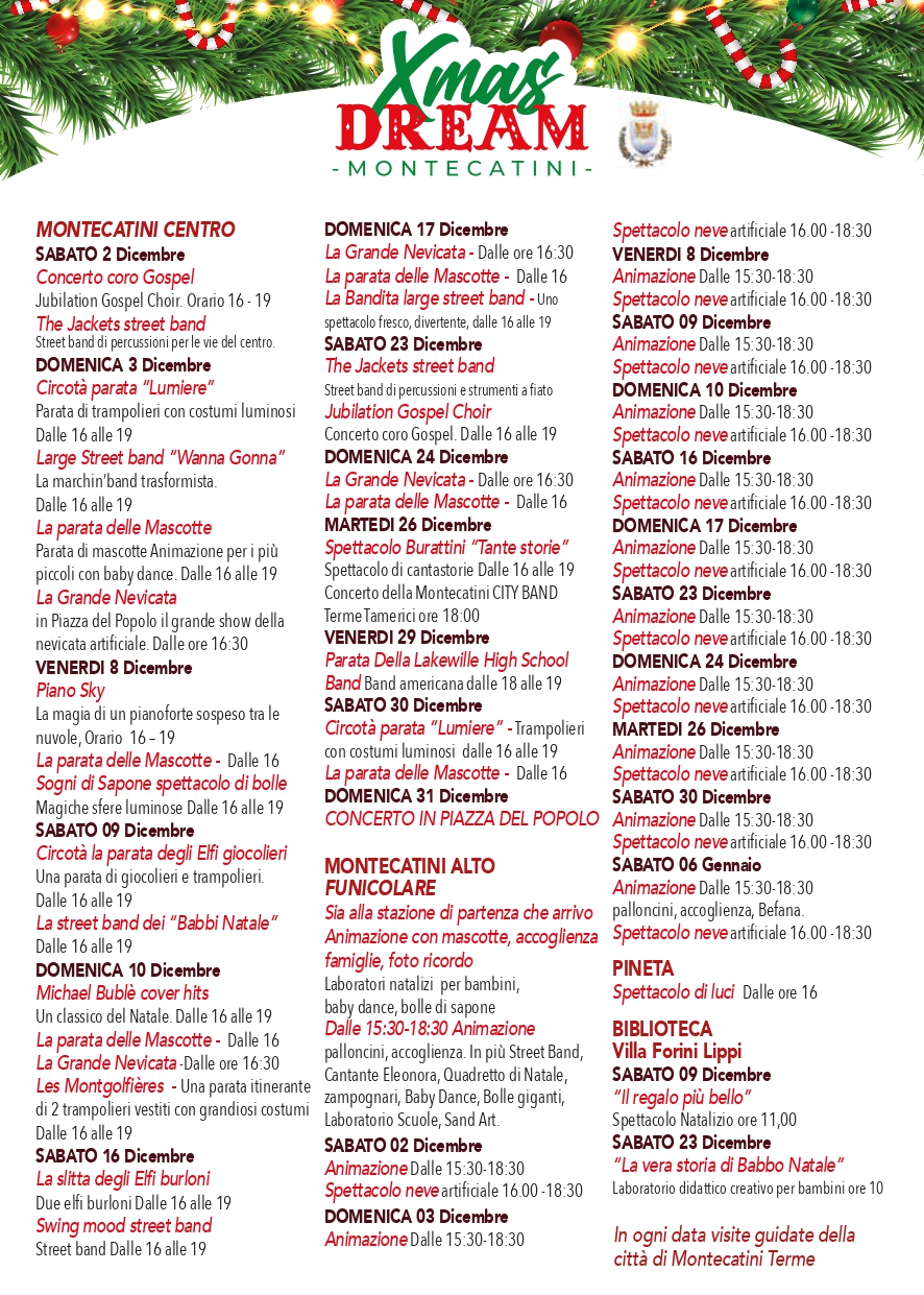 Per i più piccoli, un ricco programma con caccia al tesoro, spettacolo di burattini e distribuzione dei regali e dei dolciumi dalla Befana in persona. Ad accompagnare gli eventi, ogni mezz’ora, dalle 16 alle 18.30, un’emozionante nevicata artificiale in piazza del Popolo a Montecatini Alto.