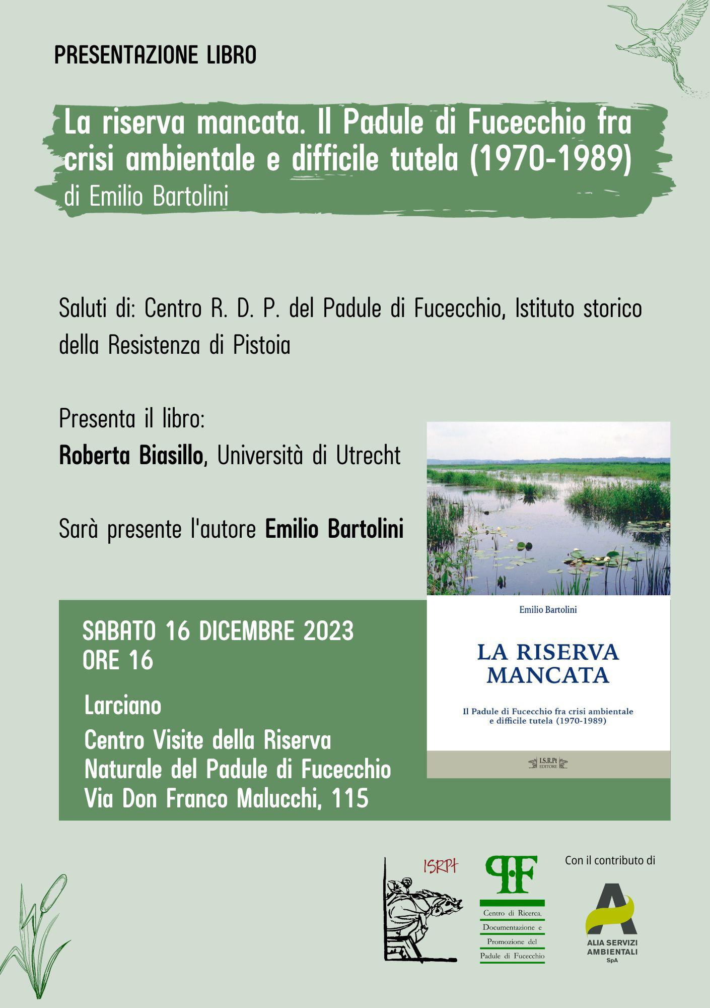 Sabato 16 dicembre alle ore 16, presso il Centro Visite del Padule di Fucecchio, presentazione del libro La Riserva mancata. Il Padule di Fucecchio fra crisi ambientale e difficile tutela (1970-1989) di Emilio Bartolini. Dialoga con l’autore Roberta Biasillo.