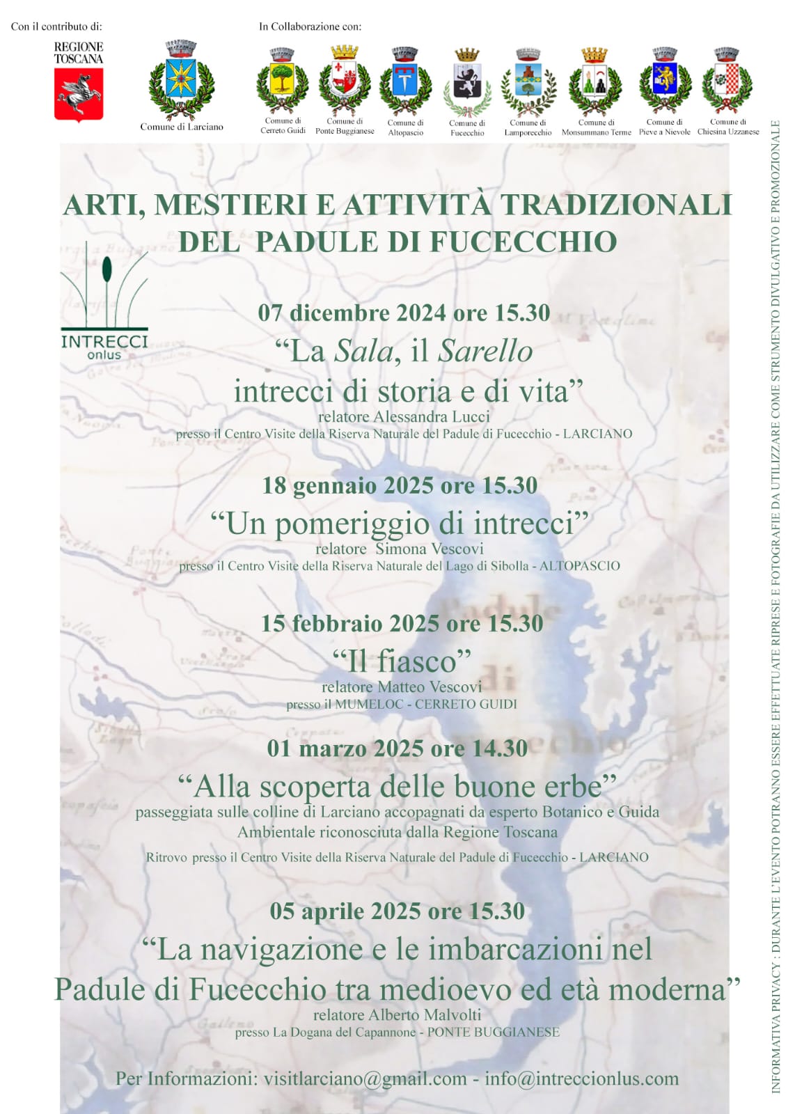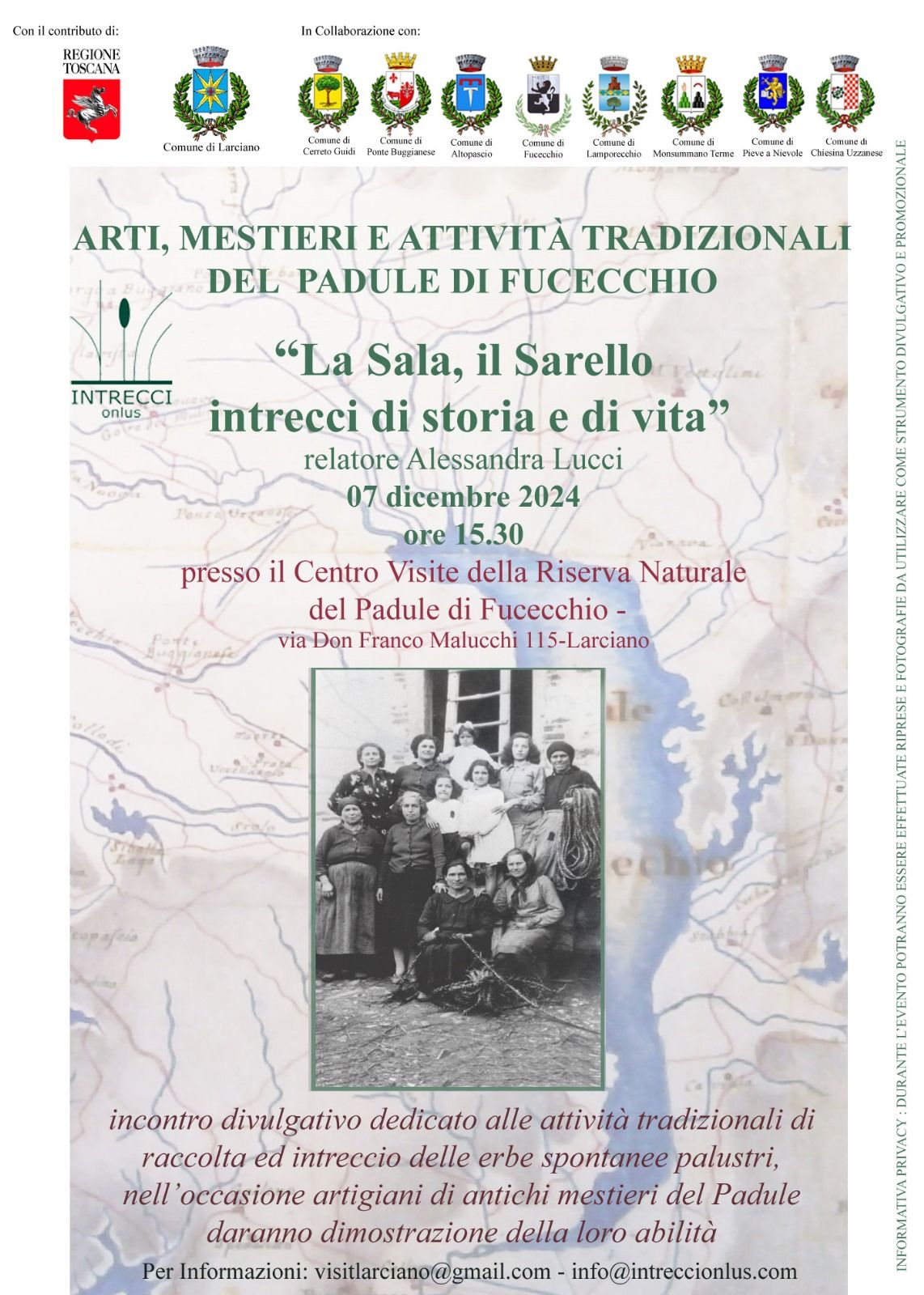 All’interno della rassegna Arti, mestieri e attività tradizionali del padule di Fucecchio, sabato 7 dicembre 2024, dalle 15.30 alle 16.30, presso il centro visite della Riserva Naturale del Padule di Fucecchio, incontro La Sala, il Sarello intrecci di storia e di vita. Relatore Alessandra Lucci.