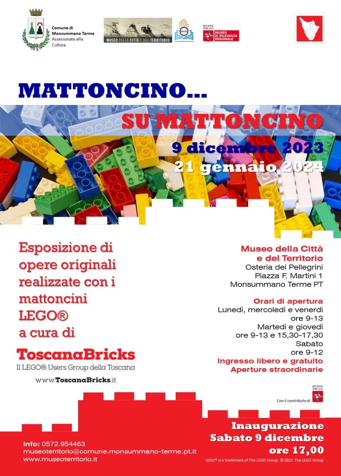 Da sabato 9 dicembre a domenica 21 gennaio, presso il Museo della Città e del Territorio di Monsummano Terme, nella seicentesca Osteria dei pellegrini, mostra Mattoncino… su mattoncino a cura di ToscanaBricks, Il LEGO® Users Group della Toscana.