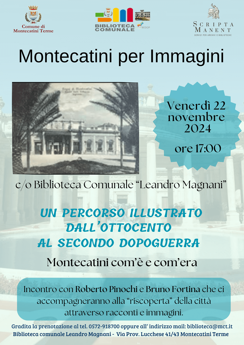 Venerdì 22 novembre 2024, alle ore 17, presso la Biblioteca Leandro Magnani di Montecatini Terme, incontro con Roberto Pinochi e Bruno Fortina dal titolo Montecatini per immagini.