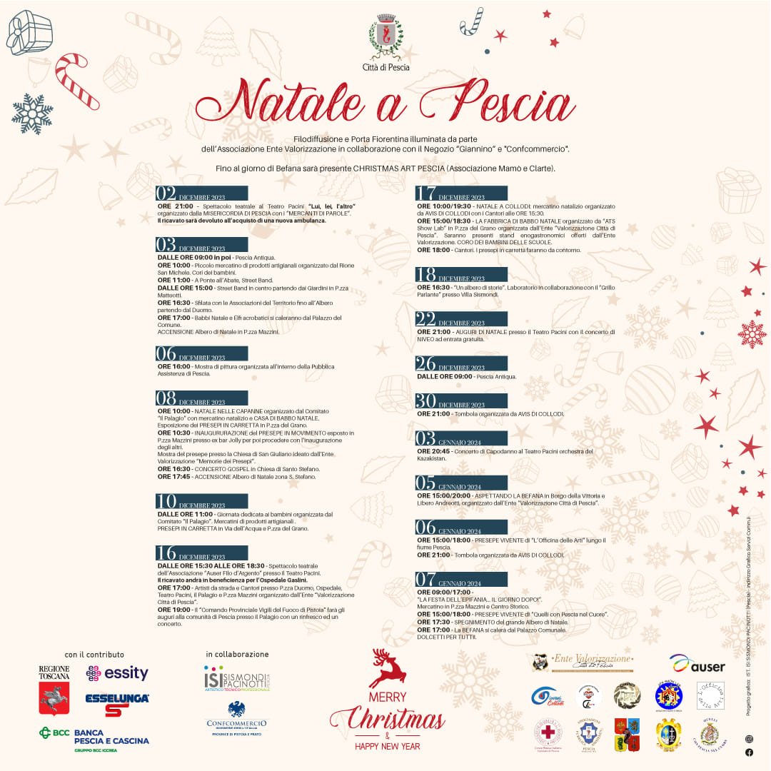 L’Amministrazione Comunale di Pescia, in sinergia con le Associazioni e i commercianti del territorio, festeggia il Natale con mercatini, musica, spettacoli e tante occasioni per i più piccoli.