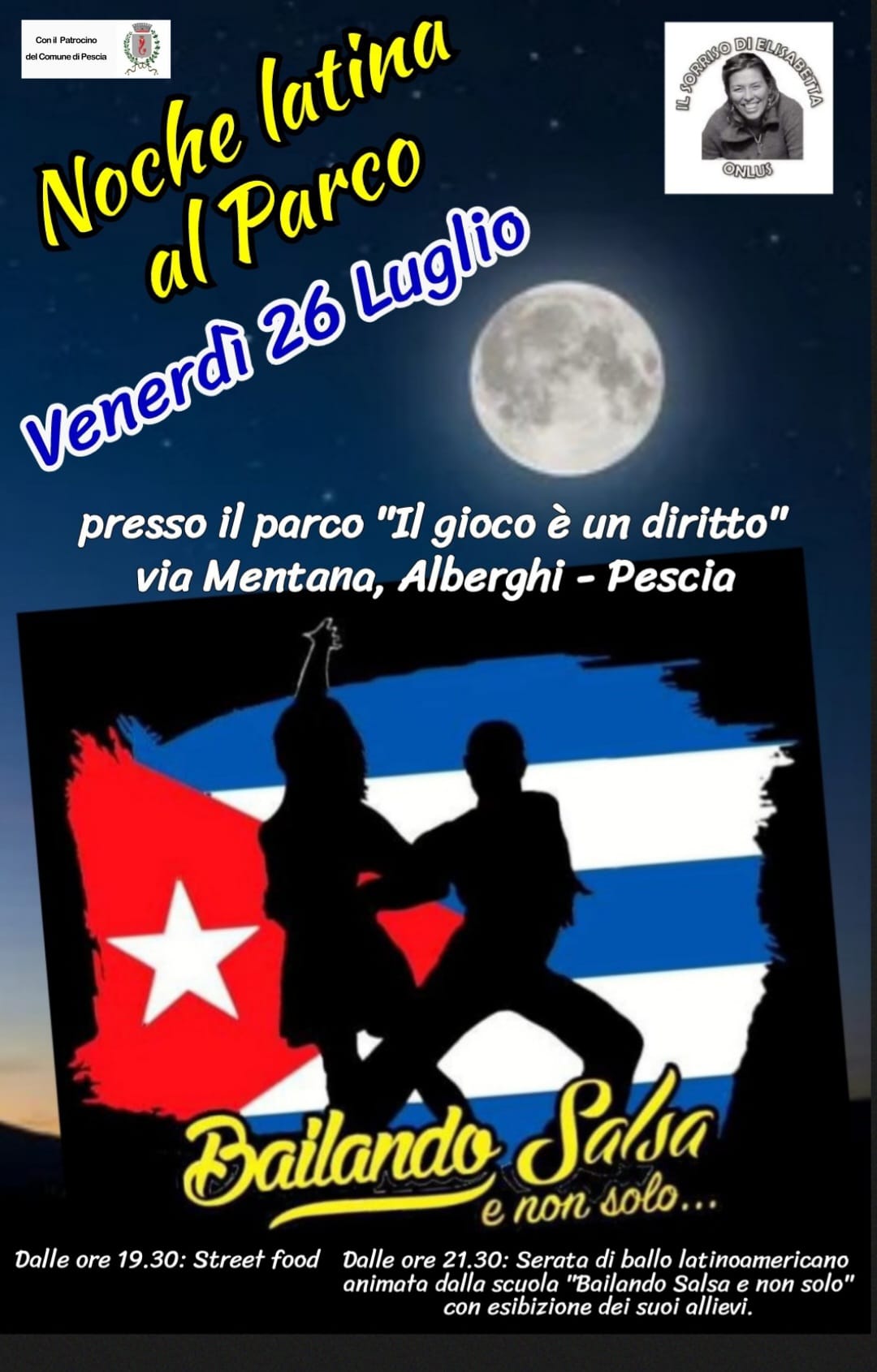 Venerdì 26 luglio 2024, dalle ore 21.30, presso il parco Il gioco è un diritto di Pescia, serata latinoamericana animata dalla scuola Bailando Salsa E Non Solo ASD con esibizioni dei suoi allievi.