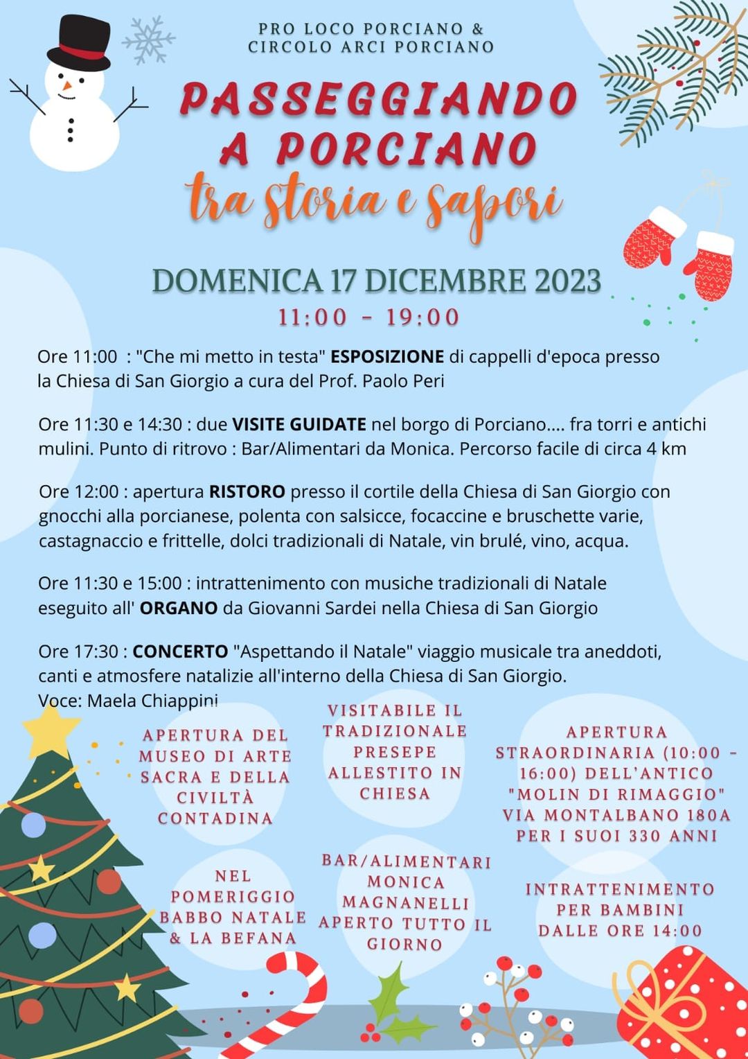 Domenica 17 dicembre, a Porciano, concerti, mostre, intrattenimento, storia locale, aperture straordinarie e tante gustose specialità in uno dei luoghi più panoramici del Montalbano.