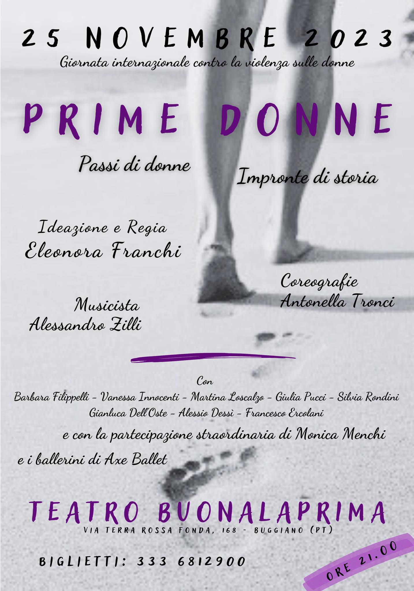 Sabato 25 novembre alle ore 21, presso il Teatro Buonalaprima va in scena Prime donne, spettacolo completo con prosa, musica, canto e ballo. Ideazione e regia di Eleonora Franchi, con la partecipazione straordinaria di Monica Menchi.