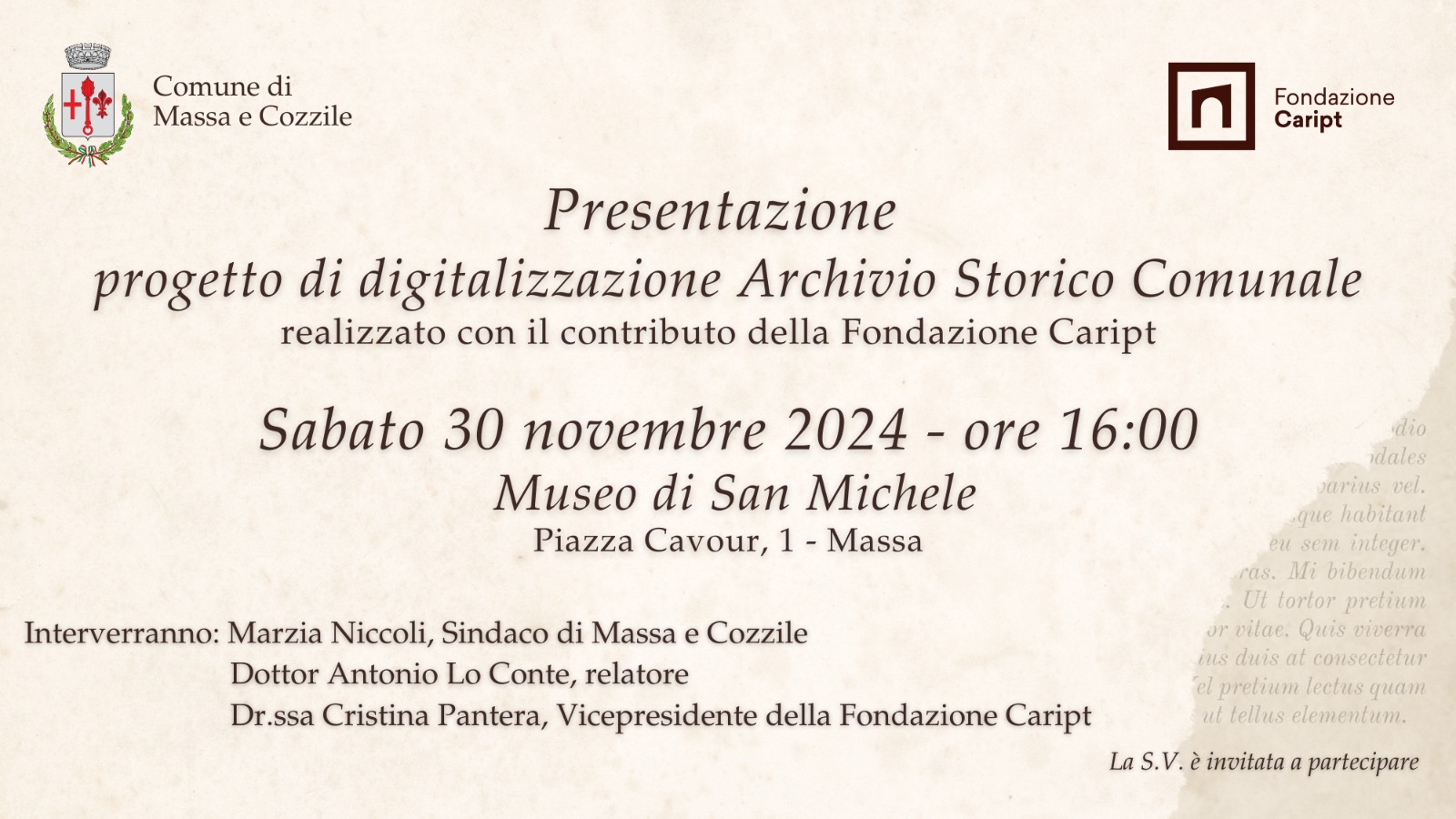 Sabato 30 novembre 2024, alle ore 16, presso il Museo di San Michele a Massa, presentazione del progetto di digitalizzazione dell’Archivio Storico Comunale realizzato con il contributo della Fondazione Caript.