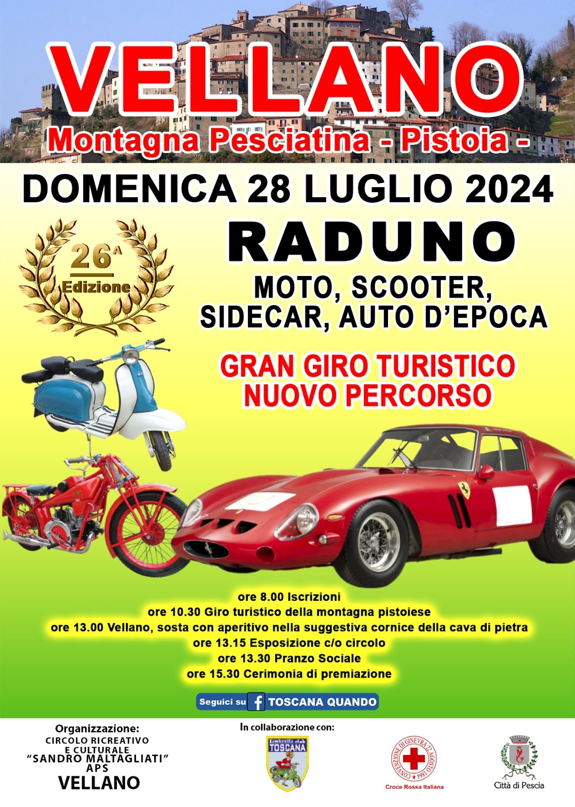Domenica 28 luglio 2024, torna il tradizionale appuntamento con il raduno di moto, scooter, sidecar e auto d’epoca organizzato dal circolo Sandro Maltagliati aps di Vellano, nella montagna pesciatina. La XXVI edizione si presenta con tutta la sua carica emotiva e con qualche interessante novità.