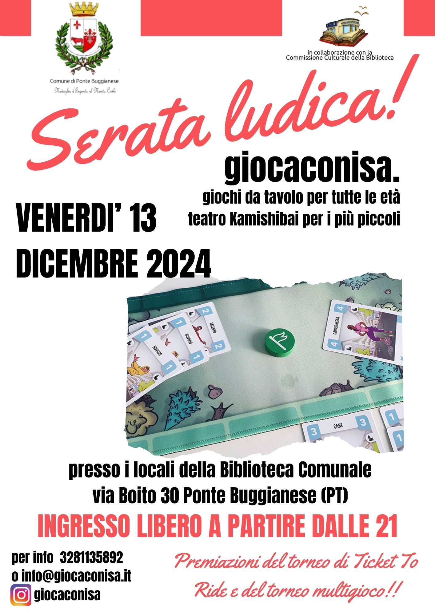 Venerdì 13 dicembre 2024, dalle ore 21, presso la Biblioteca Comunale di Ponte Buggianese, proseguono le serate ludiche con Giocaconisa, al fine di creare momenti di aggregazione e promuovere l’universo dei giochi da tavolo adatti a bambini e adulti.