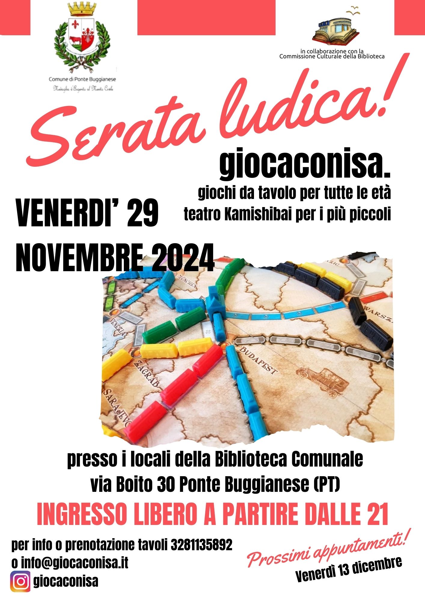 Venerdì 29 novembre 2024, presso la Biblioteca Comunale di Ponte Buggianese, proseguono le serate ludiche con Giocaconisa, al fine di creare momenti di aggregazione e promuovere l’universo dei giochi da tavolo adatti a bambini e adulti.