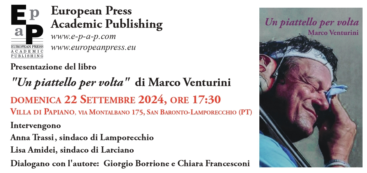Domenica 22 settembre 2024, alle ore 17.30, presso gli spazi di Villa di Papiano a Lamporecchio, presentazione del libro Un piattello per volta di Marco Venturini.