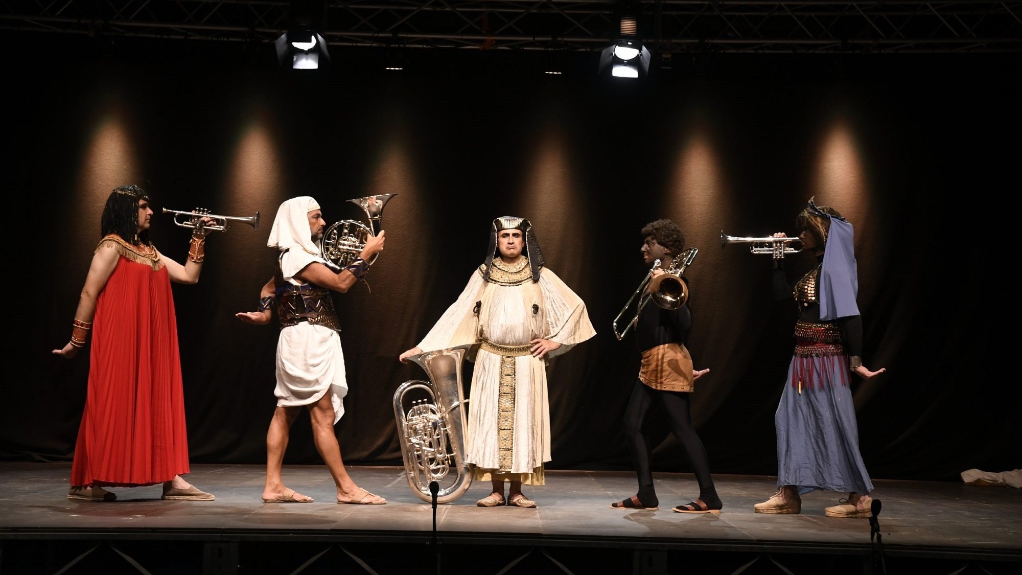 Cinque musicisti in abiti di scena suonano, cantano, interpretano, recitano, ballano l’opera, trasformandosi di volta in volta in Aida, Radames, Amneris, Il Faraone, Amonasro, in un rapido susseguirsi di arie, musica e prosa.